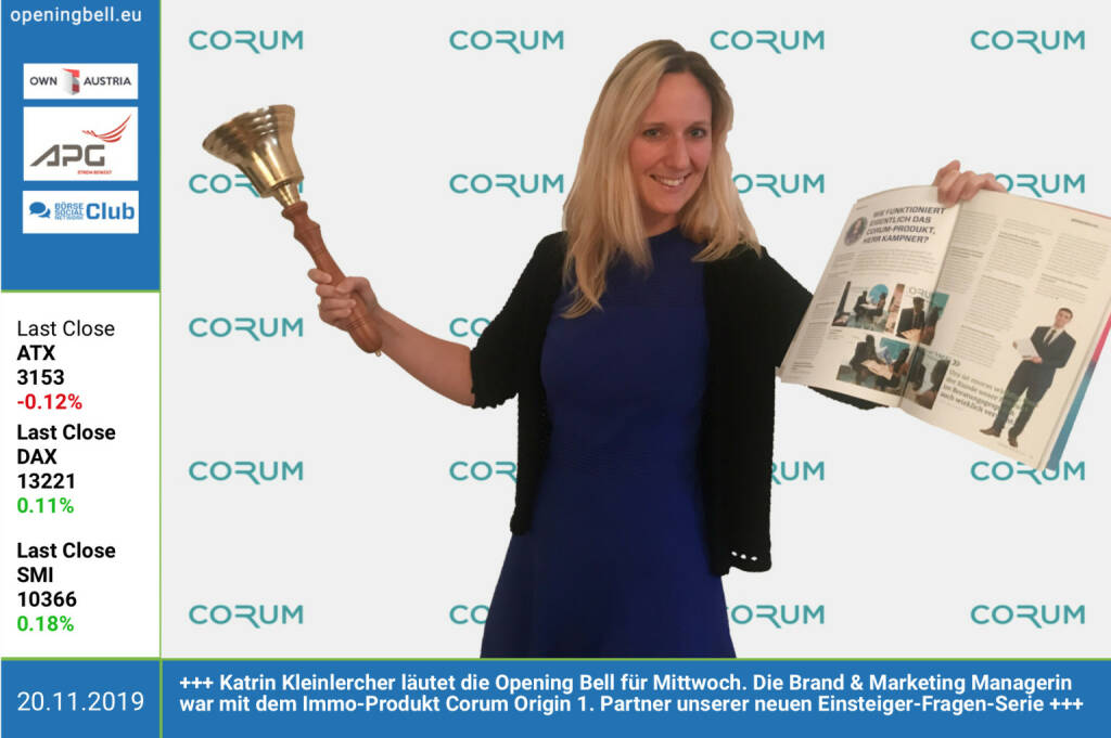 20.11.: Katrin Kleinlercher läutet die Opening Bell für Mittwoch. Die Brand & Marketing Managerin war mit dem Immobilien-Produkt Corum Origin 1. Partner unserer neuen Einsteiger-Fragen-Serie im http://www.boerse-social.com/magazine https://www.corum-investment.at (20.11.2019)