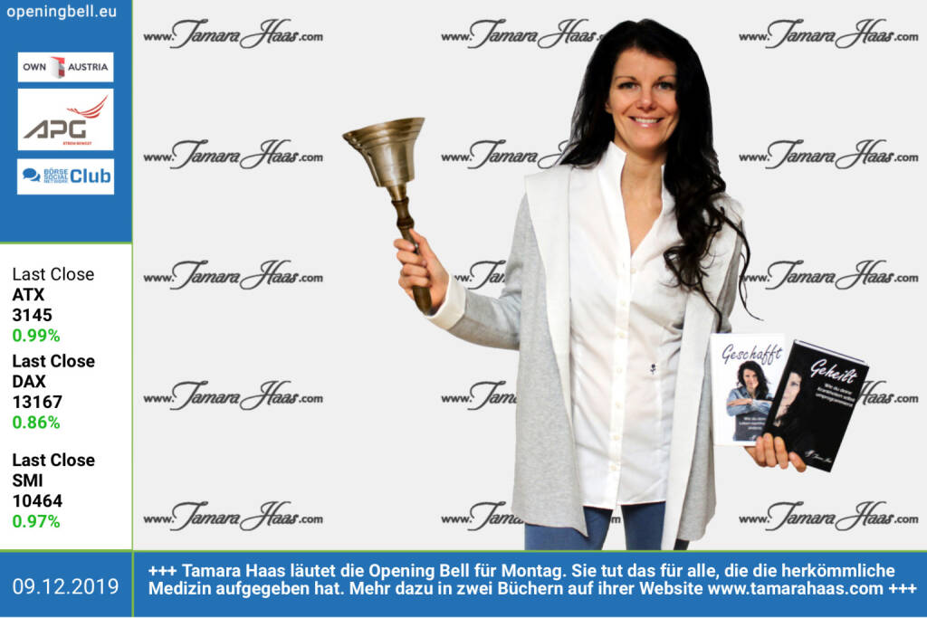 9 12.: Tamara Haas läutet die Opening Bell für Montag. Sie tut das für alle, die von der herkömmlichen Medizin aufgegeben wurden. Mehr dazu in zwei Büchern auf ihrer Website http://www.tamarahaas.com (09.12.2019)