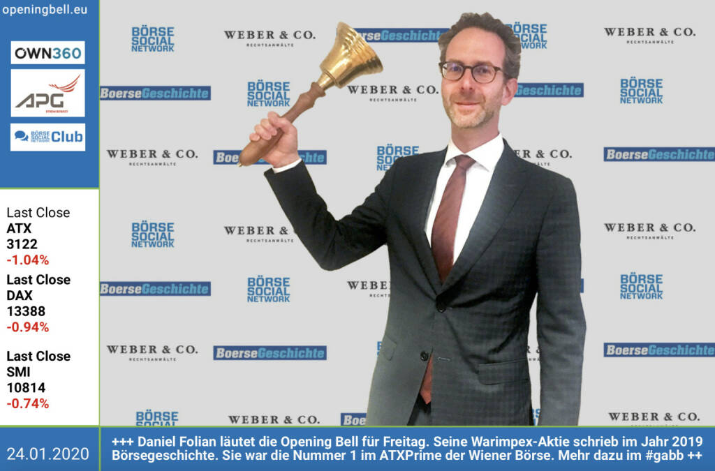 24.1.: Daniel Folian läutet die Opening Bell für Freitag. Seine Warimpex-Aktie schrieb im Jahr 2019 Börsegeschichte. Sie war die Nummer 1 im ATXPrime der Wiener Börse. Mehr dazu im #gabb http://www.warimpex.com http://www.boerse-social.com/gabb (24.01.2020)