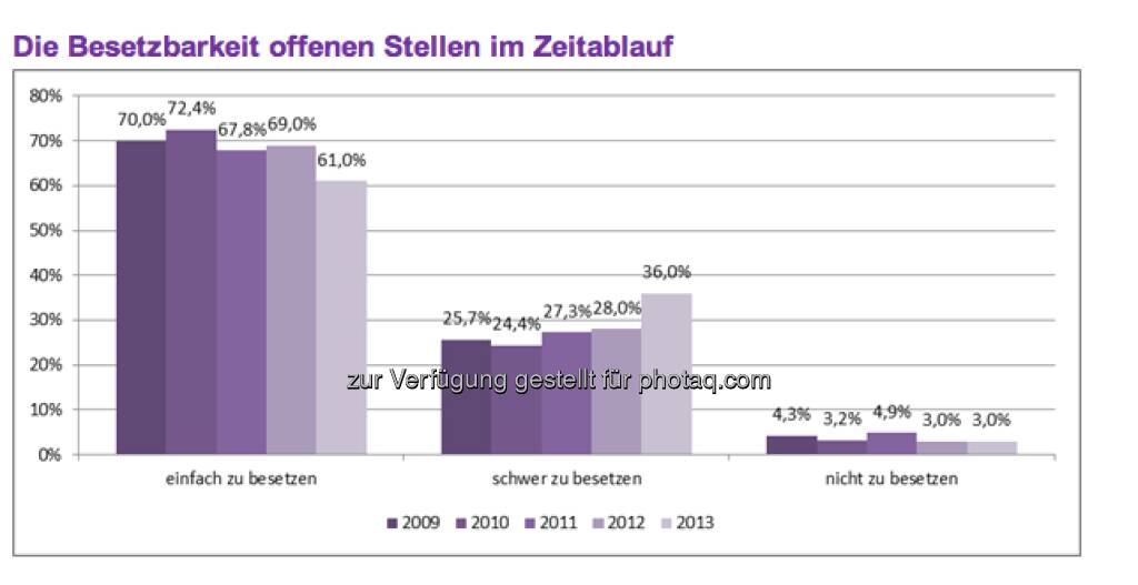 Die 500 größten österreichische Unternehmen erwarten, dass 39,0 Prozent ihrer offenen Stellen im Jahr 2013 nur schwer oder gar nicht mit neuen Mitarbeitern besetzt werden können. Insgesamt haben alle befragten Unternehmen im Jahr 2013 vakante Positionen zu besetzen, wobei die Mehrzahl der Unternehmen eine Wiederbesetzung freigewordener Positionen plant und nicht von einem Nettoanstieg der Mitarbeiteranzahl ausgeht. (c) Monster (11.04.2013)