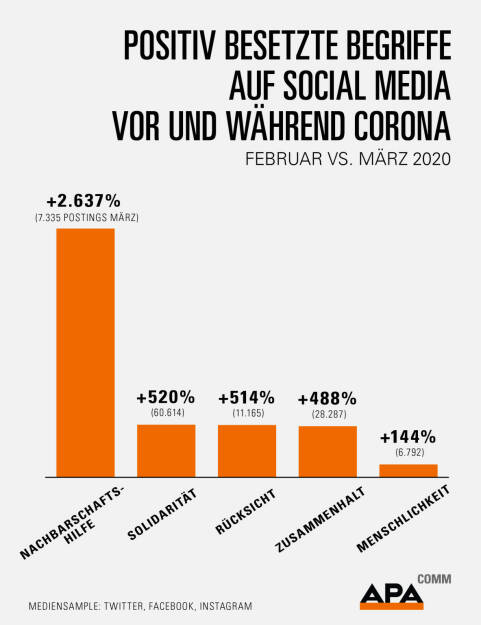 Social-Media-Analyse von APA-Comm: Positiv besetzte Begriffe gewinnen in sozialen Netzwerken während der Corona-Krise teils massiv an Präsenz: Während Begriffe wie „Social Distancing“, „Schutzmaske“ oder „Isolation“ in der öffentlichen Diskussion allgegenwärtig sind, zeichnet sich über andere wie „Nachbarschaftshilfe“, „Menschlichkeit“ oder „Gemeinwohl“ zeitgleich ein Bild erhöhten Zusammenhalts ab. Fotocredit:APA-Comm, © Aussender (16.04.2020)