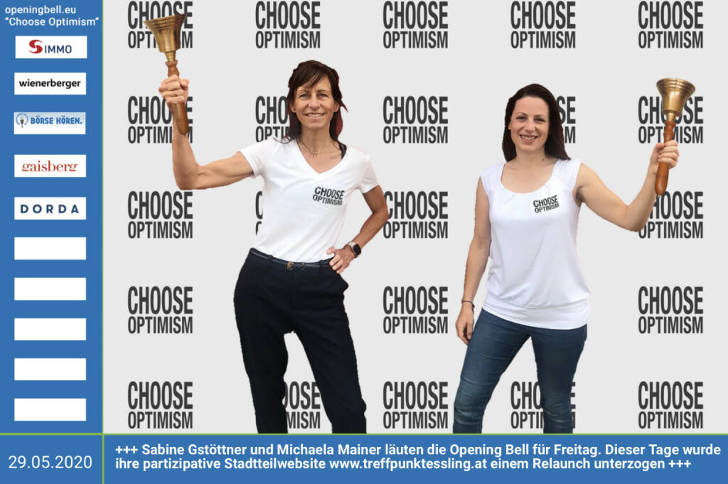 29.5.: Sabine Gstöttner und Michaela Mainer läuten die Opening Bell(s) für Freitag, Long Distance Style (vorher/nachher unter https://photaq.com//page/index/3781). Dieser Tage wurde ihre partizipative Stadtteilwebsite http://www.treffpunktessling.at einem Relaunch unterzogen mehr Infos unter http://www.openingbell.eu mehr Choose Optimism: https://boerse-social.com/category/choose_optimism https://www.facebook.com/chooseoptimism/ (29.05.2020)