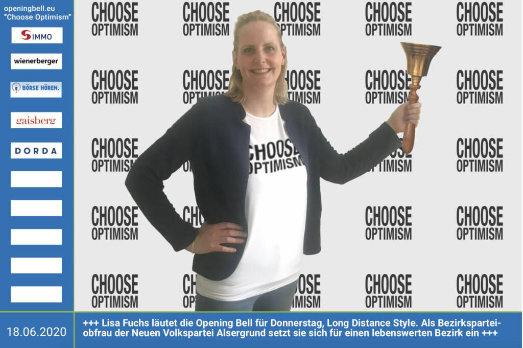 18.6.: Lisa Fuchs läutet die Opening Bell für Donnerstag, Long Distance Style (vorher/nachher unter https://photaq.com//page/index/3781). Als Bezirksparteiobfrau der Neuen Volkspartei Alsergrund setzt sich die begeisterte Alsergrunderin für einen lebenswerten Bezirk ein https://neuevolkspartei.wien/bezirke/alsergrund/ mehr Infos unter http://www.openingbell.eu mehr Choose Optimism: https://boerse-social.com/category/choose_optimism https://www.facebook.com/chooseoptimism/ (18.06.2020)