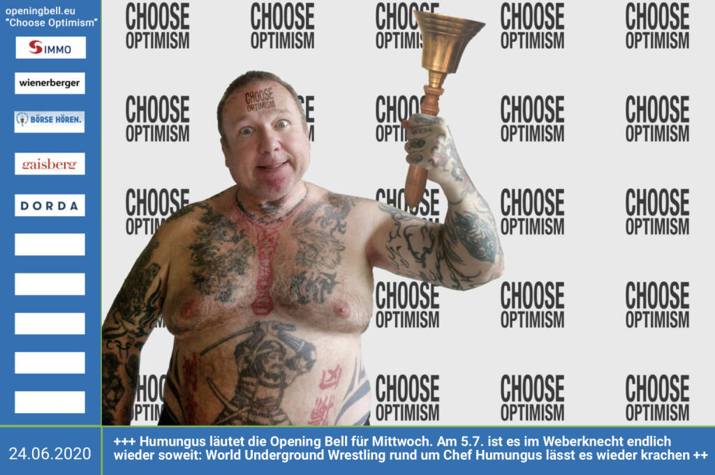 24.6.: Humungus läutet die Opening Bell für Mittwoch, Long Distance Style (vorher/nachher unter https://photaq.com//page/index/3781). Nach langer Durststrecke ist es am 5.7. im Weberknecht - siehe http://www.wrestlingschoolaustria.at/events05jul20.htm - endlich wieder soweit: Die Publikumslieblinge der World Underground Wrestling – hier im Bild Humungus, ihr Chef – lassen es wieder krachen! In die Goschn! Humungus freut sich über Österreichs erstes Wrestling-Magazin "In die Goschn", das im Herbst erstmalig erscheinen wird. mehr Infos unter http://www.openingbell.eu mehr Choose Optimism: https://boerse-social.com/category/choose_optimism https://www.facebook.com/chooseoptimism/ Humungus: „Da kommt noch einiges auf uns zu! Challenge accepted?“ (24.06.2020)