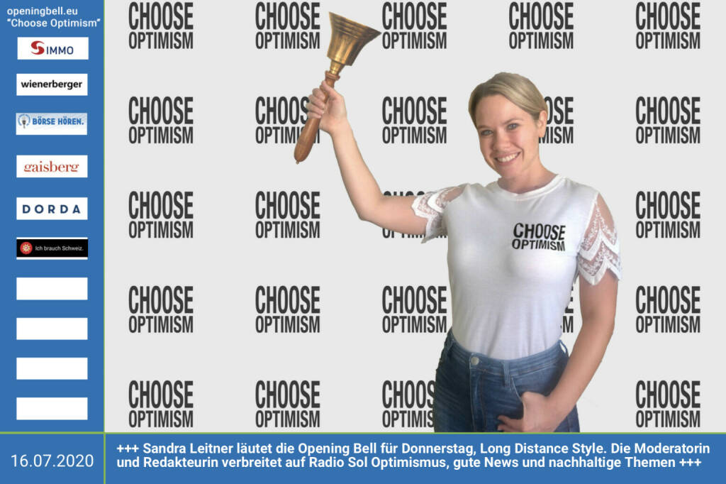 16.7.: Sandra Leitner läutet die Opening Bell für Donnerstag, Long Distance Style (vorher/nachher unter https://photaq.com//page/index/3781). Die Moderatorin und Redakteurin verbreitet auf Radio Sol Optimismus, gute Nachrichten und nachhaltige Themen. Link zum Reinhören: https://www.planetsol.eu/members/sandraleitner/. Noch mehr Infos gibt's hier: https://www.youtube.com/watch?v=G8jfxT8Bmjk http://www.openingbell.eu mehr Choose Optimism: https://boerse-social.com/category/choose_optimism https://www.facebook.com/chooseoptimism/ (16.07.2020)