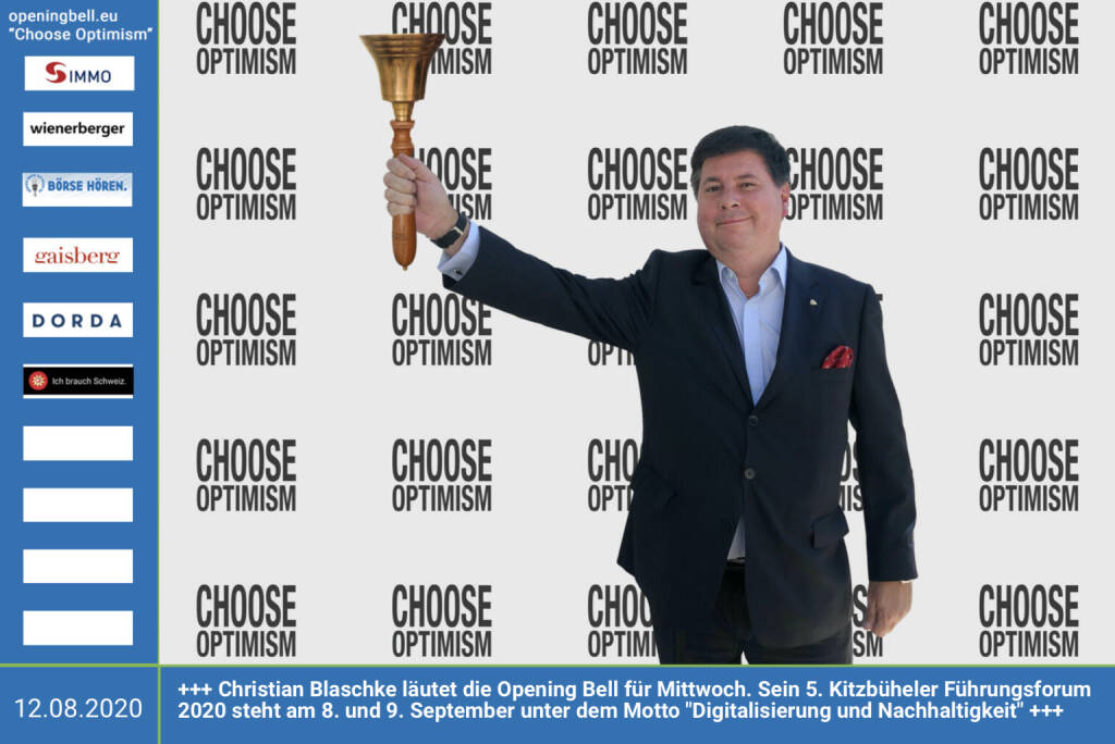 4.11.: Georg Panholzer läutet die Bell für Mittwoch. Der Medien- und Salesprofi wechselt von der Verlagsgruppe News per November zum Immobilien Magazin, wir wünschen viel Erfolg https://www.immobilien-magazin.at . Mehr Choose Optimism: https://boerse-social.com/category/choose_optimism https://www.facebook.com/chooseoptimism/ (04.11.2020)