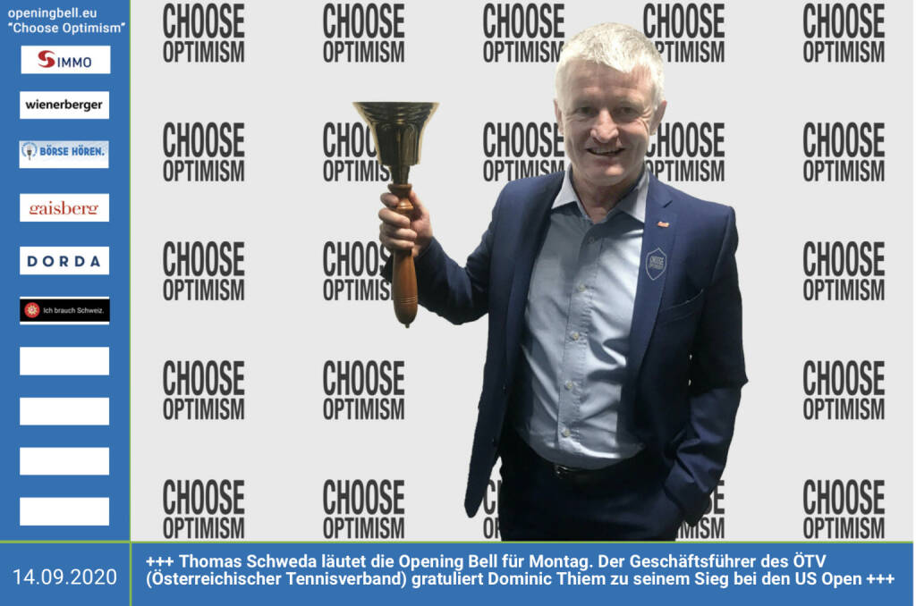 14.9.: Thomas Schweda läutet die Opening Bell für Montag. Der Geschäftsführer des ÖTV (Österreichischer Tennisverband) gratuliert Dominic Thiem zu seinem Sieg bei den US Open http://www.oetv.at https://www.emotiongroup.com/consulting/dominic-thiem http://www.sportgeschichte.at Mehr Choose Optimism: https://boerse-social.com/category/choose_optimism https://www.facebook.com/chooseoptimism/ (14.09.2020)