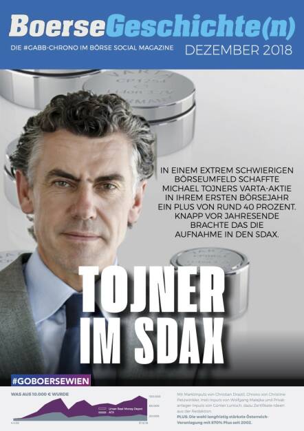 Börsegeschichte(n) Dezember 2018 - In einem extrem schwierigen Börseumfeld schaffte Michael Tojners Varta-Aktie in ihrem ersten Börsejahr ein Plus von rund 40 Prozent. Knapp vor Jahresende brachte das die Aufnahme in den SDAX. (07.08.2020)