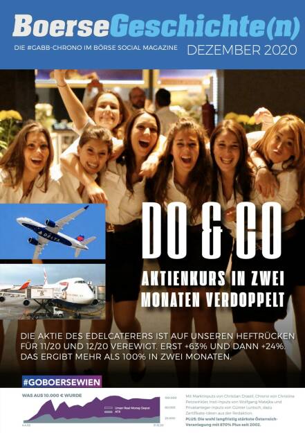 DO&CO - Aktienkurs in zwei Monaten verdoppelt. Die Aktie des Edelcaterers ist auf unseren Heftrücken für 11/20 und 12/20 verewigt. Erst +63% und dann +24%. Das ergibt mehr als 100% in zwei Monaten. (24.01.2021)