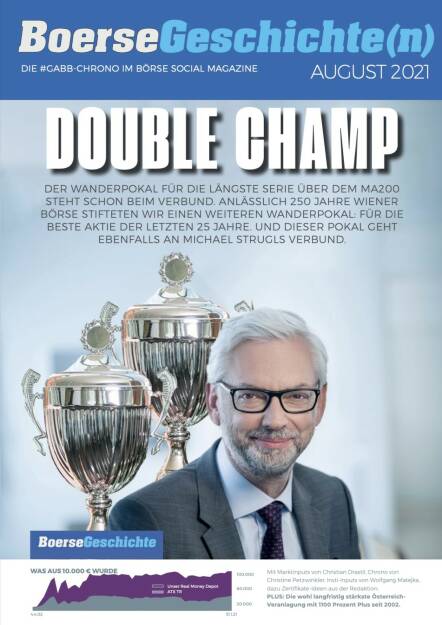 Double Champ - Der Wanderpokal für die längste Serie über dem MA200 steht schon beim Verbund. Anlässlich 250 Jahre Wiener Börse stifteten wir einen weiteren Wanderpokal: Für die beste Aktie der letzten 25 Jahre. Und dieser Pokal geht ebenfalls an Michael Strugls Verbund. (12.09.2021)