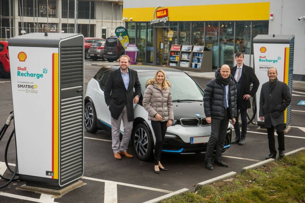 SMATRICS EnBW nimmt eine der leistungsstärksten E-Ladesäulen Wiens an Shell-Tankstelle an der Seestadt in Betrieb, Im Bild v.l.n.r.: Hauke Hinrichs, Geschäftsführer und COO SMATRICS EnBW / Astrid Adamek, Leiterin des Tankstellengeschäfts von Shell Austria GmbH / Alexander Kopecek, Vorstand Wien 3420 aspern Development AG / Paul Brozsek, Head of Development List Beteiligung GmbH / Gert Seybold, Geschäftsführer Shell Austria GmbH, Credit: Shell, © Aussender (16.12.2020)