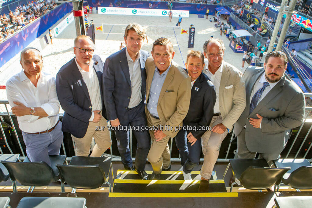 Helmut Saller (Geschäftsführer bei The Swatch Group), Marc Harms (Geschäftsführer Union Investment Austria), Gerald Fleischmann (Generaldirektor der Volksbank Wien AG), Peter Hanke (Stadtrat für Finanzen, Wirtschaft, Digitalisierung und Internationales), Skisprungstar Andreas Goldberger, Erwin Soravia (CEO Soravia-Gruppe) und Sascha Haimovici (CEO IVV und Immo-Contract) - Volksbank Wien AG: Volksbank, Union Investment und IVV luden zum Auftakt der Beach Volleyball EM 2021 in Wien C. Mikes Fotocredit:leadersnet.at / C. Mikes, © Aussendung (13.08.2021)