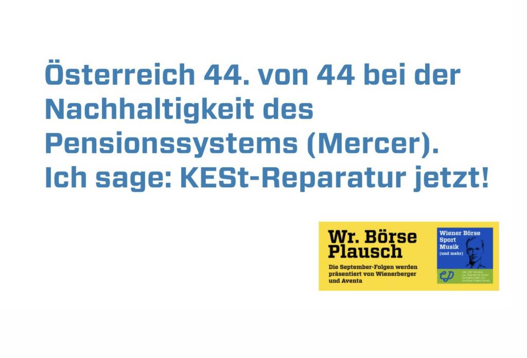Österreich 44. von 44 bei der Nachhaltigkeit des Pensionssystems (Mercer). Ich sage: KESt-Reparatur jetzt! Dies und mehr in Folge S3/26 der Wiener Börse Pläusche im Rahmen von http://www.christian-drastil.com/podcast . (17.10.2022)