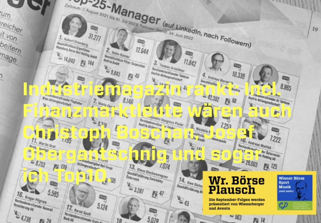 Das Industriemagazin rankt: Incl. Finanzmarktleute wären auch Christoph Boschan, Josef Obergantschnig und sogar ich Top10. Dies und mehr in Folge S3/44 der Wiener Börse Pläusche im Rahmen von http://www.christian-drastil.com/podcast . (11.11.2022)