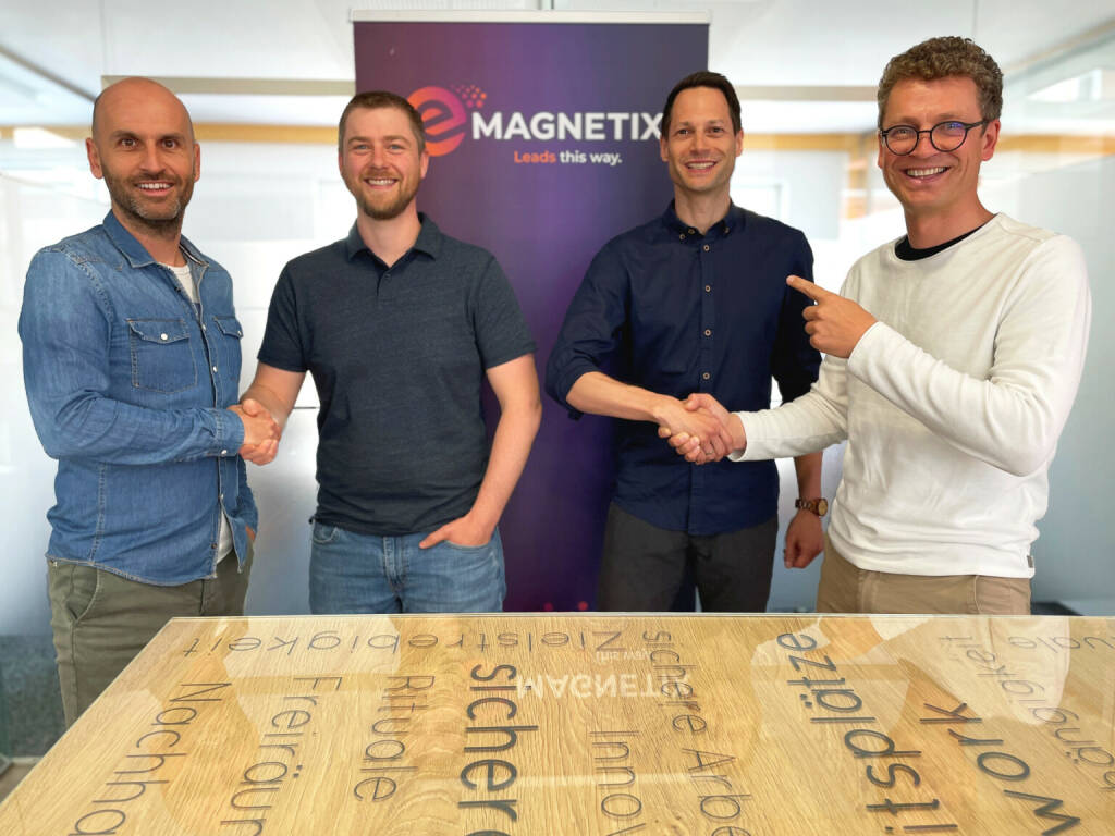 eMAGNETIX Online Marketing GmbH: Zwei kommen, zwei gehen: Neue Geschäftsführung bei eMAGNETIX, Nach 15 Jahren übergeben Thomas Fleischanderl (rechts außen) und Klaus Hochreiter (links außen) die Geschäftsführung von eMAGNETIX an Andreas Gärtner (2.v.r.) und Stefan Mitmansgruber (2.v.l.). Credit: eMAGNETIX , © Aussender (23.05.2023)