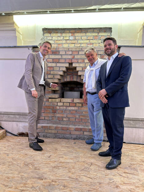 Strabag und Wiener Staatsoper legen den Grundstein für den Französischen Saal im Künstlerhaus, Grundsteinlegung und Einbringung der Zeitkapsel durch Bogdan Roščić, Hans Peter Haselsteiner und Klemens Haselsteiner, Credit: Strabag/Atha Athanasiadis, © Aussender (24.05.2023)