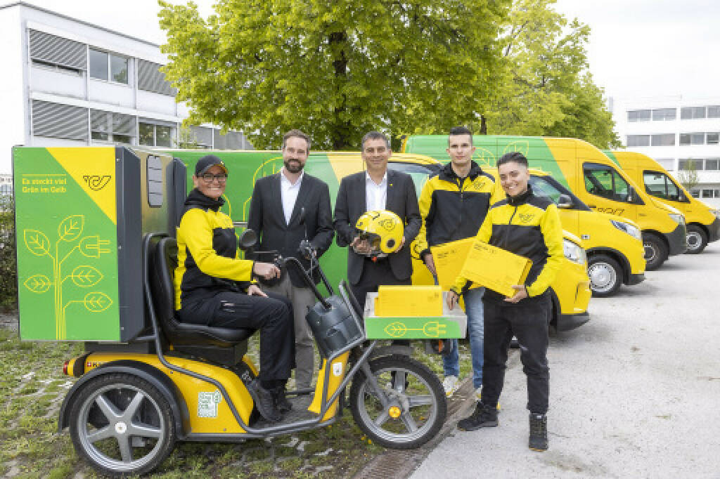 Post startet grüne Zustellung in Salzburg: Die Zustellerin Sara Mefailoski, Österreichische Post AG, Stefan Schnöll, Landeshauptmann-Stellvertreter von Salzburg, Peter Umundum, Vorstandsdirektor für Paket & Logistik, die Zusteller*innen Varga Mark und Krisztina Varga, alle Österreichische Post AG. (v.l.) Foto: Österreichische Post, © Aussender (26.04.2024)