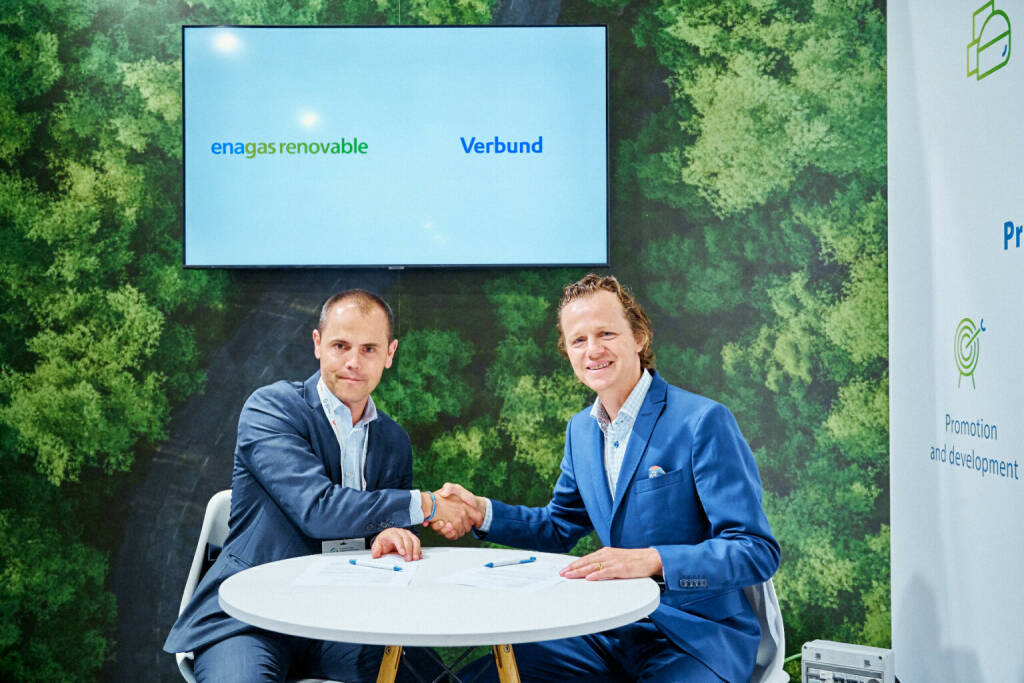 Strategische Zusammenarbeit Enagás Renovable und VERBUND: am Bild: Antón Martínez, CEO Enagás Renovable, Franz Helm, Managing Director VERBUND Green Hydrogen GmbH Credits: „Connecting Green Hydrogen Europe 2024“ Foto: Verbund, © Aussender (22.07.2024)