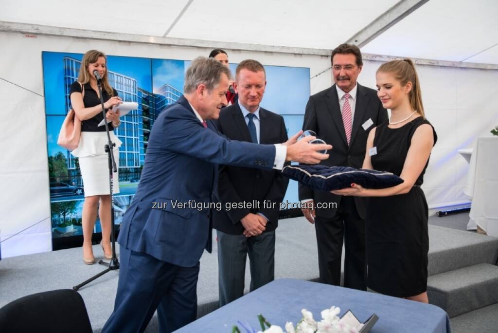 Bettina Schragl, Eduard Zehetner (Mitte), Porr-Bau-Geschäftsführer Franz Scheibenecker und Architekt Marek Tryzybowicz, © Immofinanz via http://blog.immofinanz.com/de/2013/05/21/immofinanz-eine-zeitkapsel-fuer-nimbus-viele-bilder-und-vier-unterschriften/ (21.05.2013)