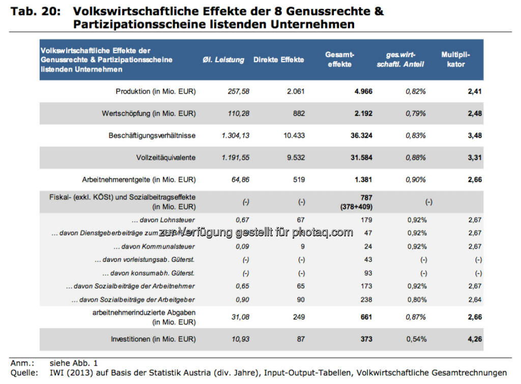 Volkswirtschaftliche Effekte der 8 Genussrechte & Partizipationsscheine listenden Unternehmen, © IWI (17.11.2013)