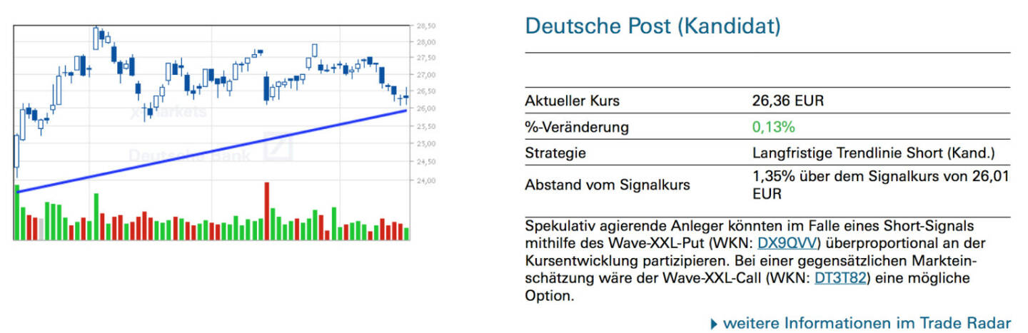 Deutsche Post (Kandidat): Spekulativ agierende Anleger könnten im Falle eines Short-Signals mithilfe des Wave-XXL-Put (WKN: DX9QVV) überproportional an der Kursentwicklung partizipieren. Bei einer gegensätzlichen Markteinschätzung wäre der Wave-XXL-Call (WKN: DT3T82) eine mögliche Option.Foto © Quelle: www.trade-radar.de