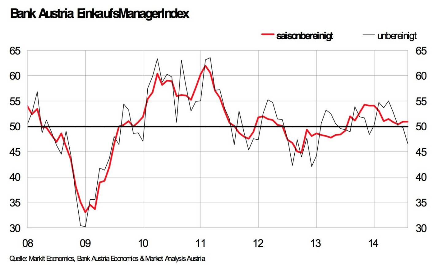 Bank Austria EinkaufsManagerIndex im August: Unverändert bei 50,9 Punkten, Österreichs Industrie wächst dank Auslandsnachfrage mit geringem Tempo, schwache Inlandsaufträge führen aber zu Rückgang der Gesamtnachfrage (Grafik: Bank Austria)