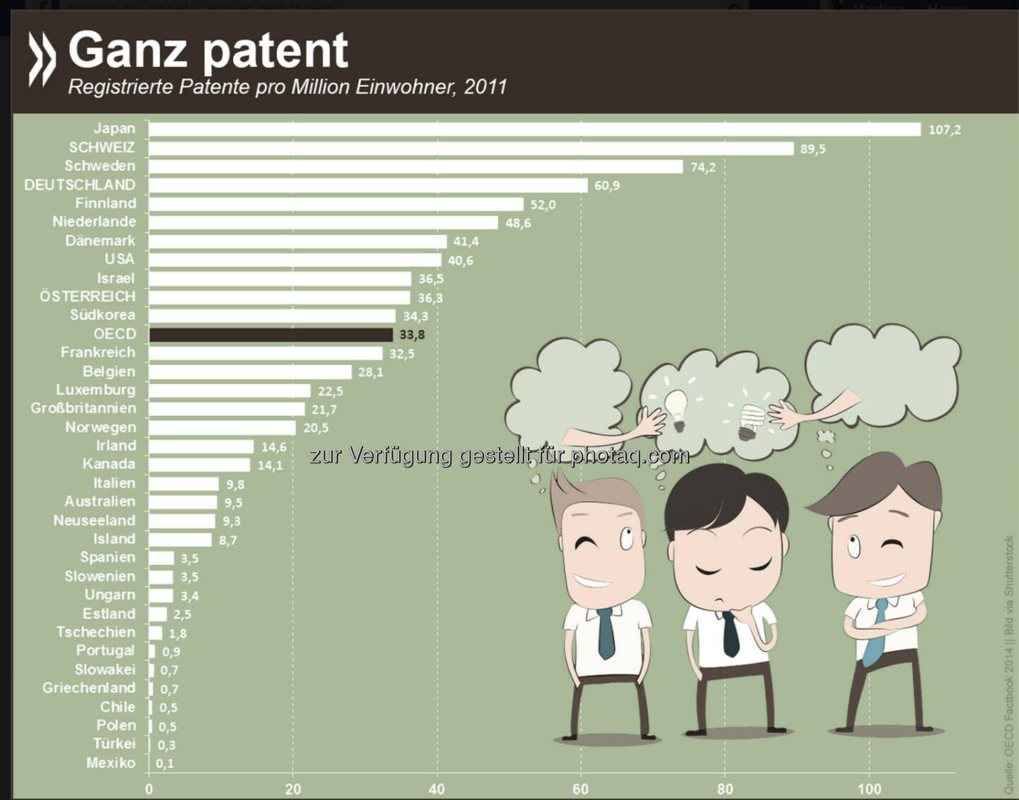 Ganz patent: Gemessen an der Einwohnerzahl ist die Anzahl der neu registrierten Patente in Japan und der Schweiz OECDweit am höchsten. Auch Deutsche und Österreicher sichern sich überdurchschnittlich oft ihre Ideen. Weltweit wurden 2011 rund 43 600 Patente angemeldet.