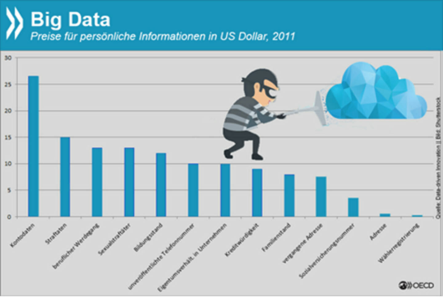 Big data, big business: Die Basis für zielgenaue Online-Werbung sind gute Nutzerdaten. Der Wert unterschiedlicher Informationen variiert allerdings erheblich. Kontodaten sind mit über 25 US-Dollar am teuersten, Adress- oder Wählerinfos hingegen kommen für einige Cents. http://bit.ly/1MsEVJG