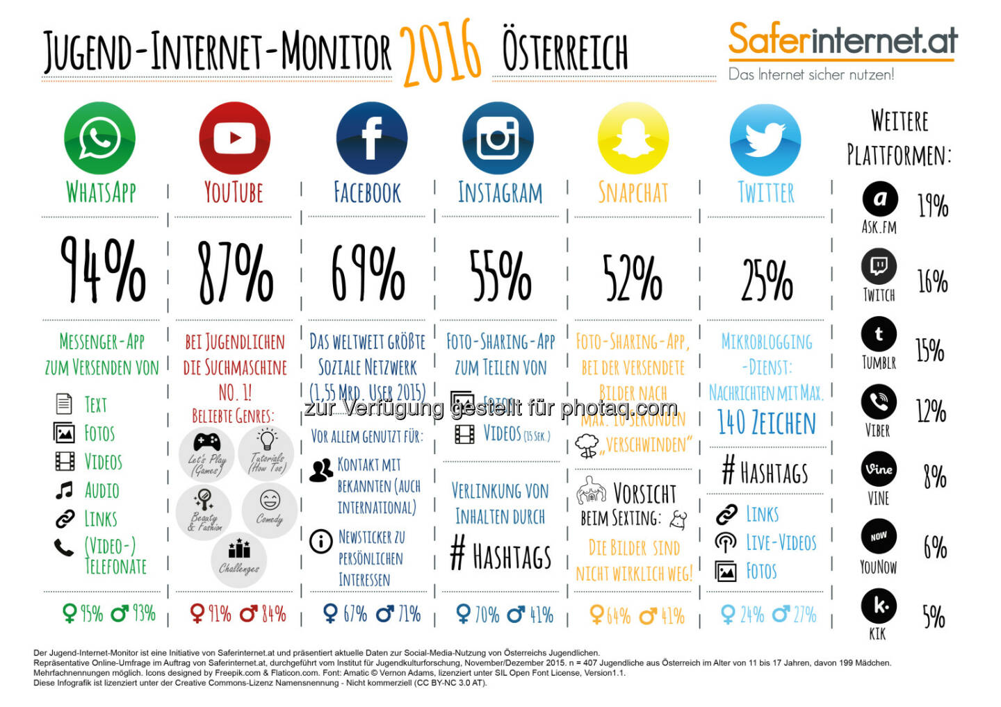 Infografik Jugend-Internet-Monitor : Bereits zum 13. Mal findet heute der internationale Safer Internet Day statt : Saferinternet.at präsentiert erstmals Jugend-Internet-Monitor mit aktuellen Daten zur Social Media-Nutzung von Österreichs Jugendlichen : Fotocredit: Saferinternet.at