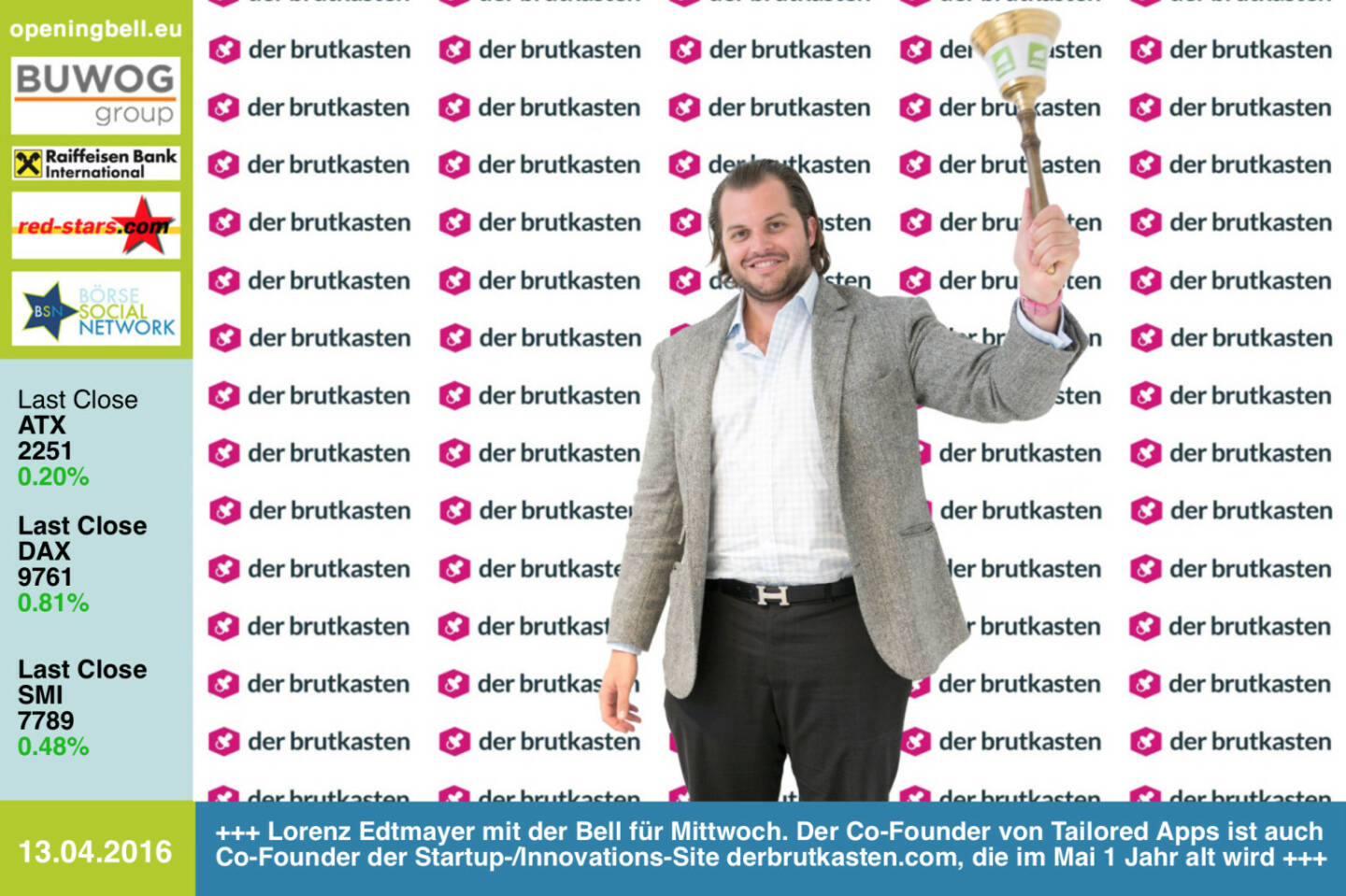 #openingbell am 13.4.: Lorenz Edtmayer mit der Bell für Mittwoch. Der Co-Founder von Tailored Apps ist auch Co-Founder der Startup-/Innovations-Site derbrutkasten.com, die im Mai ein Jahr alt wird