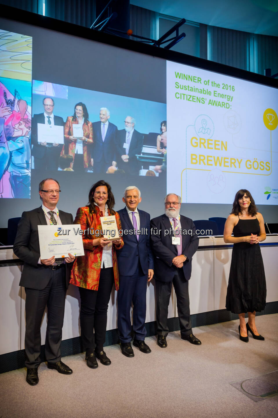 Roland Verstappen ( Heineken), Gabriela Maria Straka (Brau Union Österreich), Miguel Arias Canete (Kommissar für Klimaschutz und Energie), Jerzy Buzek (Europaparlamentarier und Vorsitzender des Europäischen Ausschusses für Industrie, Forschung und Energie/ITRE), Moderatorin : EU Sustainable Energy Awards 2016 – Brau Union Österreich ausgezeichnet : Fotocredit: A2Pix / Eric Charneux