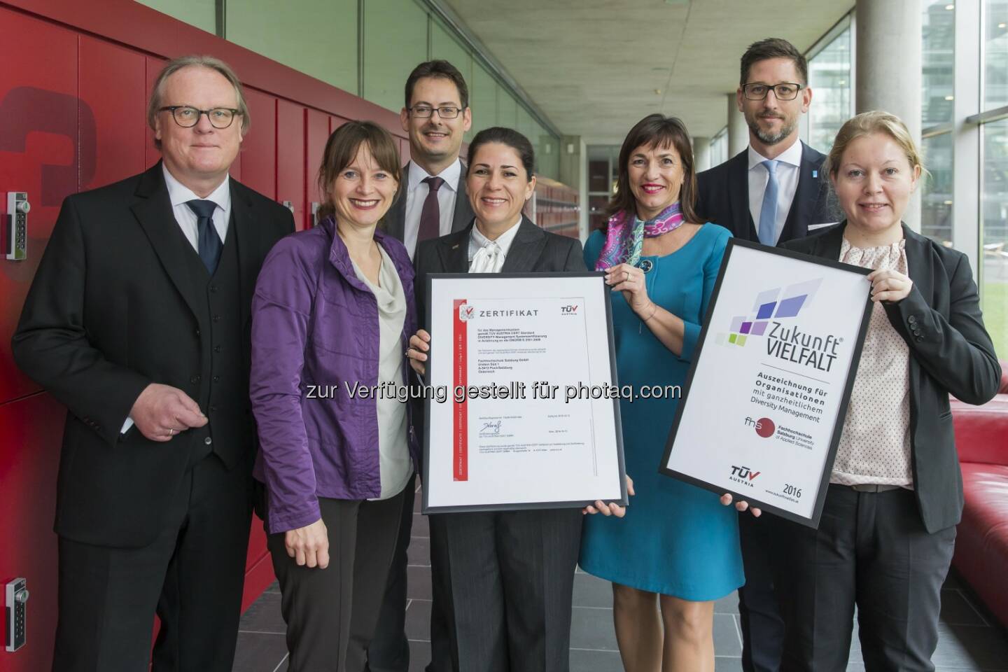 FH-Rektor Gerhard Blechinger, Martina Berthold, Peter Rieder, Eva Stockley, Doris Walter, Mathias Cimzar, Cornelia Rieß - FH Salzburg - Erste österreichische Hochschule mit Diversity-Zertifizierung (Bild: Neumayr/Leo)