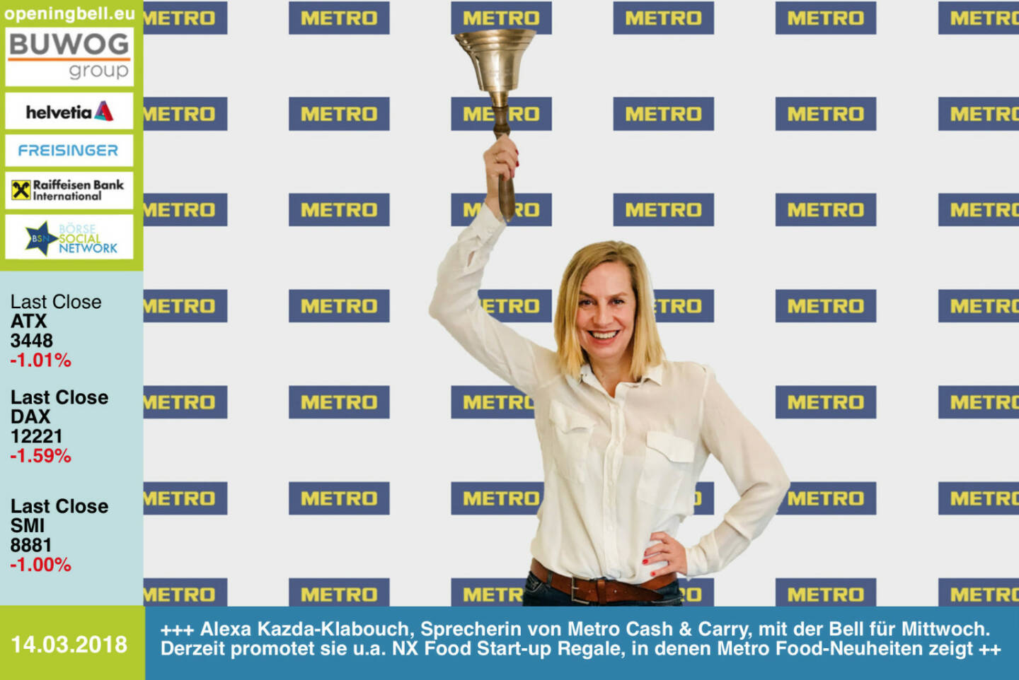 14.3.: Alexa Kazda-Klabouch, Unternehmenssprecherin von Metro Cash & Carry Österreich, läutet die Opening Bell für Mittwoch. Sonst promotet sie derzeit die NX Food Start-up Regale von Metro, in denen Newcomer ihre Food-Innovationen und Lebensmittelneuheiten präsentieren http://www.metro.athttps://www.facebook.com/groups/GeldanlageNetwork/ #goboersewien