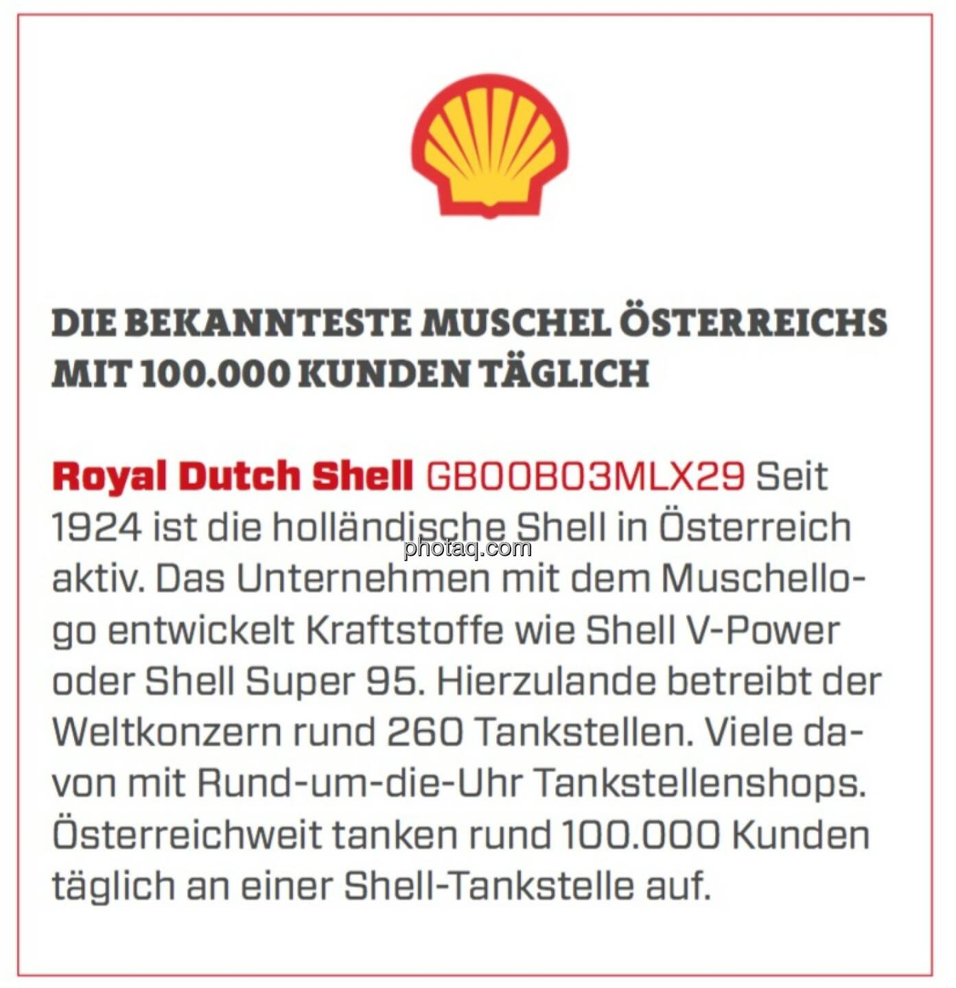 Royal Dutch Shell - Die bekannteste Muschel Österreichs mit 100.000 Kunden täglich: Seit 1924 ist die holländische Shell in Österreich aktiv. Das Unternehmen mit dem Muschellogo entwickelt Kraftstoffe wie Shell V-Power oder Shell Super 95. Hierzulande betreibt der Weltkonzern rund 260 Tankstellen. Viele davon mit Rund-um-die-Uhr Tankstellenshops. Österreichweit tanken rund 100.000 Kunden täglich an einer Shell-Tankstelle auf.